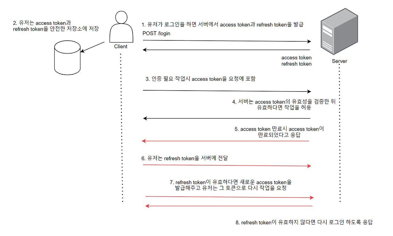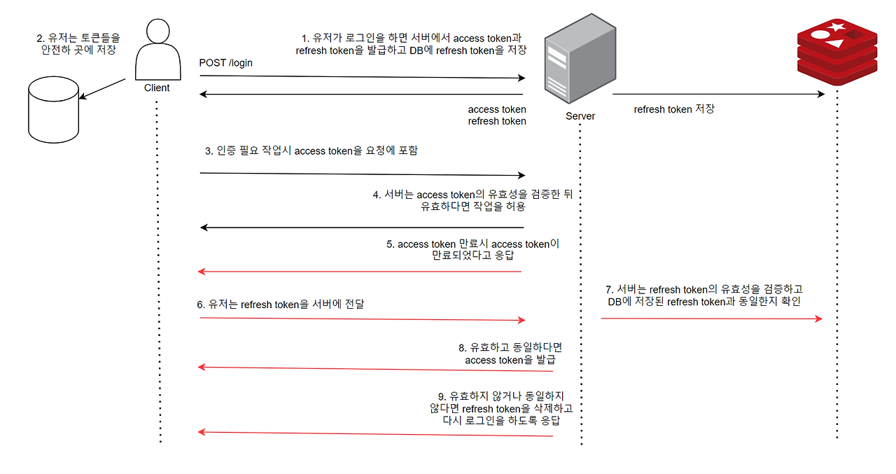- access Token 재발급을 요청하기 위해서 서버에게 refresh Token을 보내면 해당 서버는 유효성 검증을 하고 추가로 DB(Redis)에 저장된 refresh Token과 동일한지 확인한다.